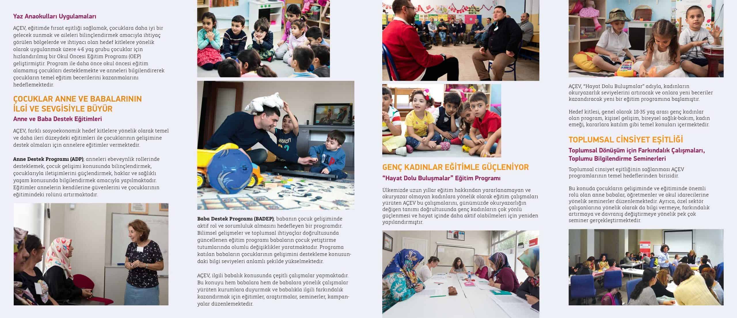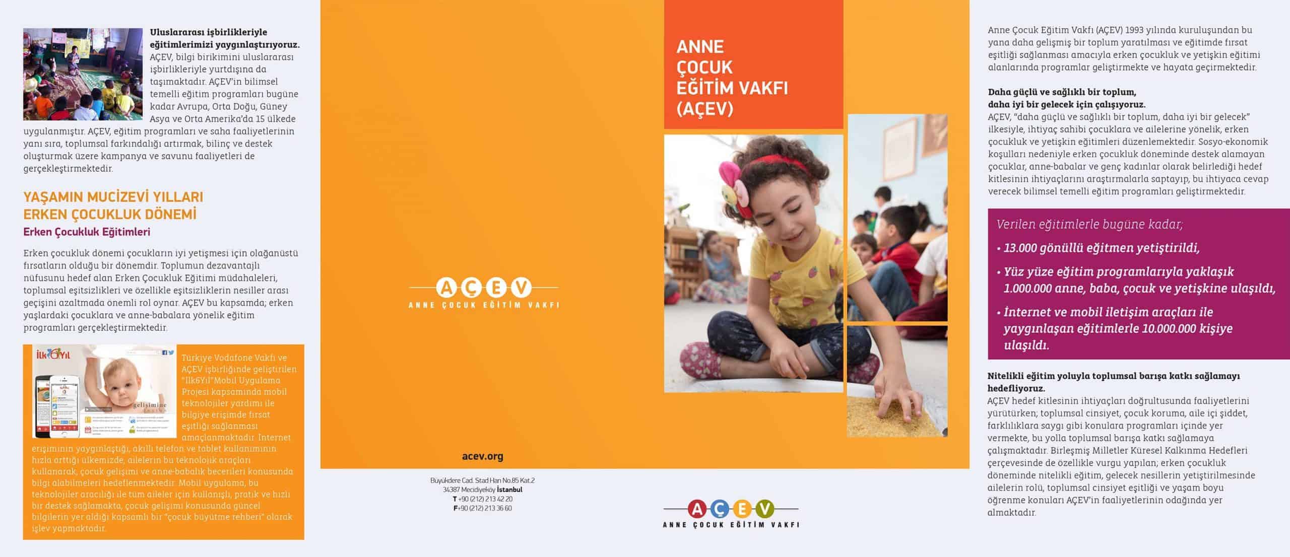 Anne Çocuk Eğitim Vakfı (AÇEV) olarak tüm çocukların eşit fırsatlara sahip olduğu bir toplum için çalışıyoruz. Erken yaşlar, hayatımızın en belirleyici dönemi olduğu için çalışmalarımızın odağını oluşturuyor. Ülkenin dört bir yanındaki ihtiyaç sahibi çocuklar, anne babalar ve genç kadınlar için bilimsel temelli eğitim programları geliştiriyor ve uyguluyoruz.