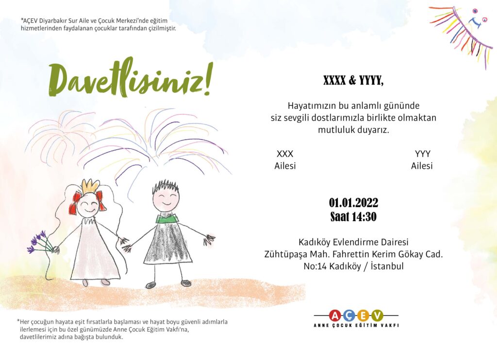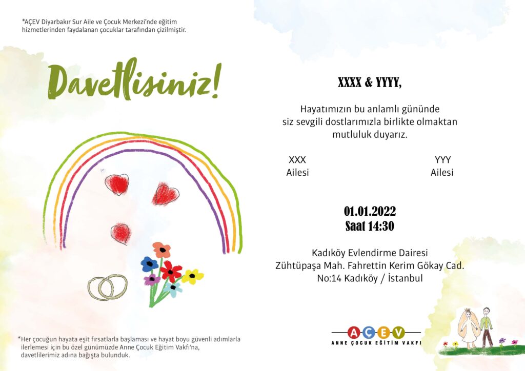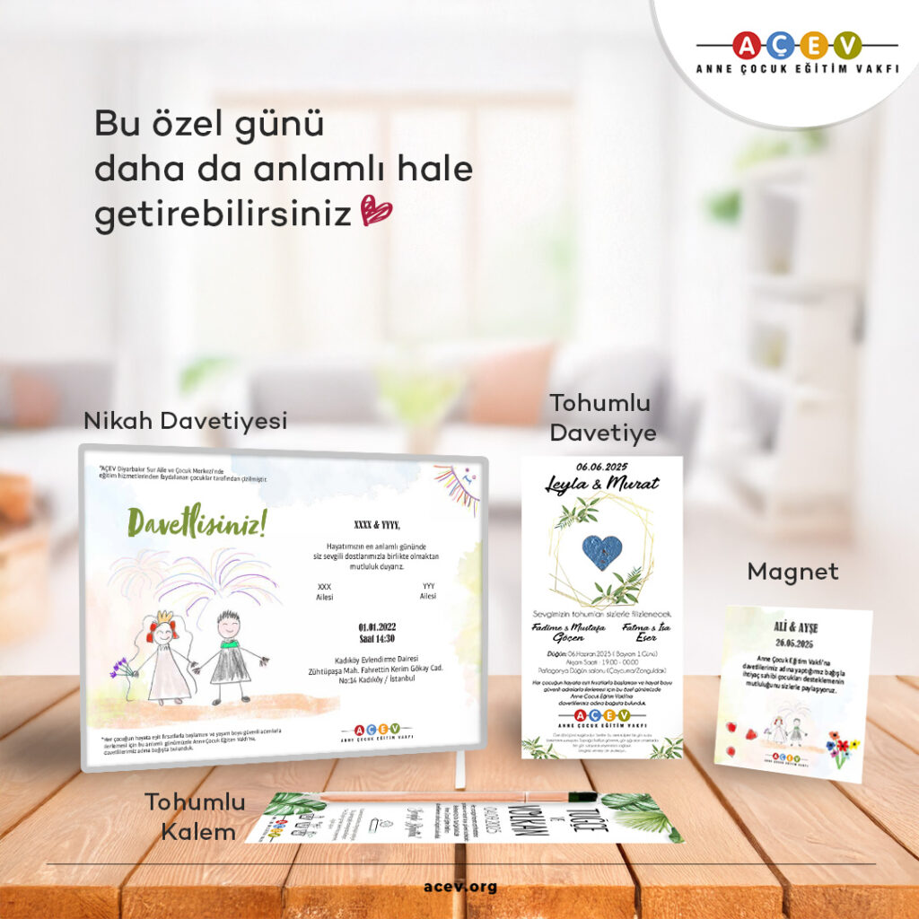 Hayatınızın en heyecan verici günlerinden biri yaklaşırken nikah davetiyesi tasarımları arayışınız da artmış olabilir. Davetiye tasarımlarınızı AÇEV ile hazırlayabilir, düğün, nikah, söz, nişan gibi özel günlerinizi bağışlarınızla daha anlamlı hale getirebilirsiniz.