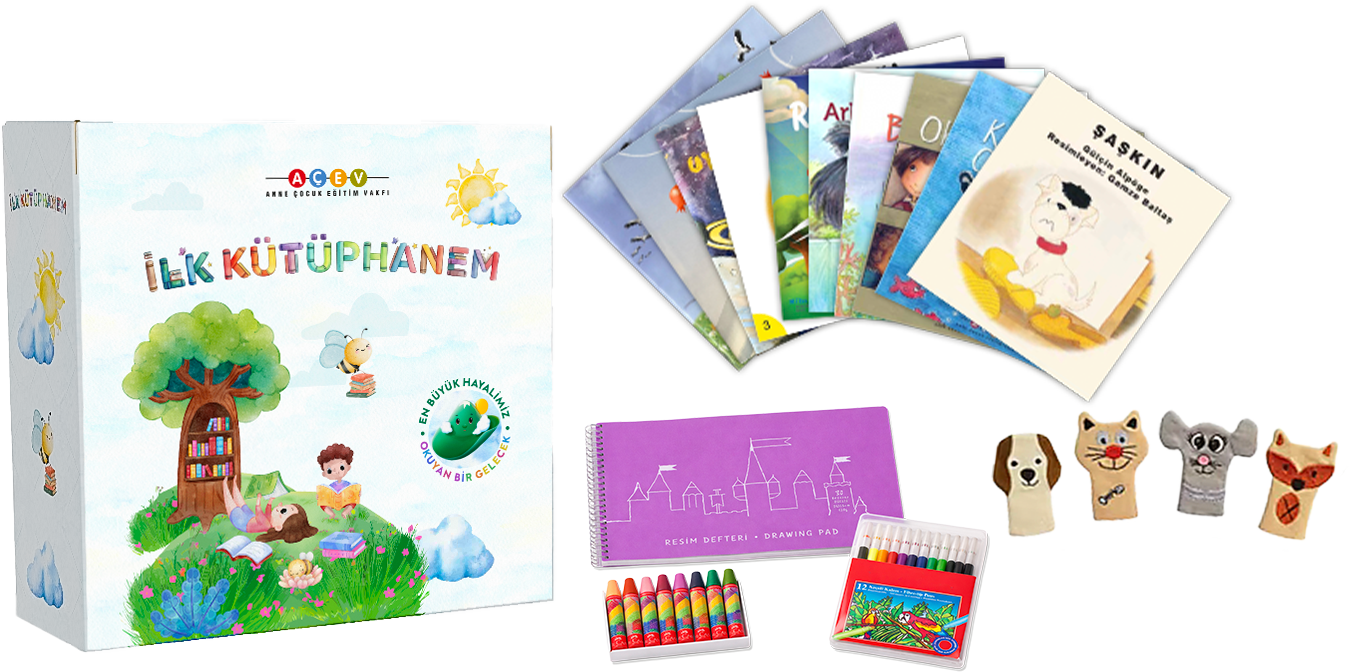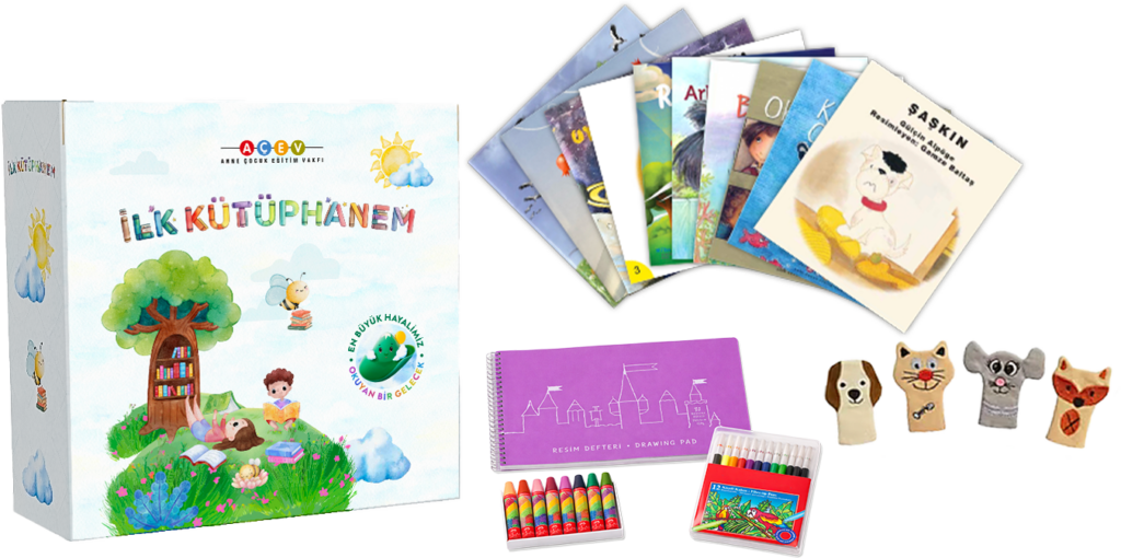 Bağışlarınızla,erken yaşlardaki çocuklara ulaştıracağımız İlk Kütüphanem Seti’nin içinde 10 adet hikaye kitabı, her bir kitap için ebeveynlere yönelik rehber, boya kalemi, pastel boya, resim defteri ve parmak kukla yer alıyor.